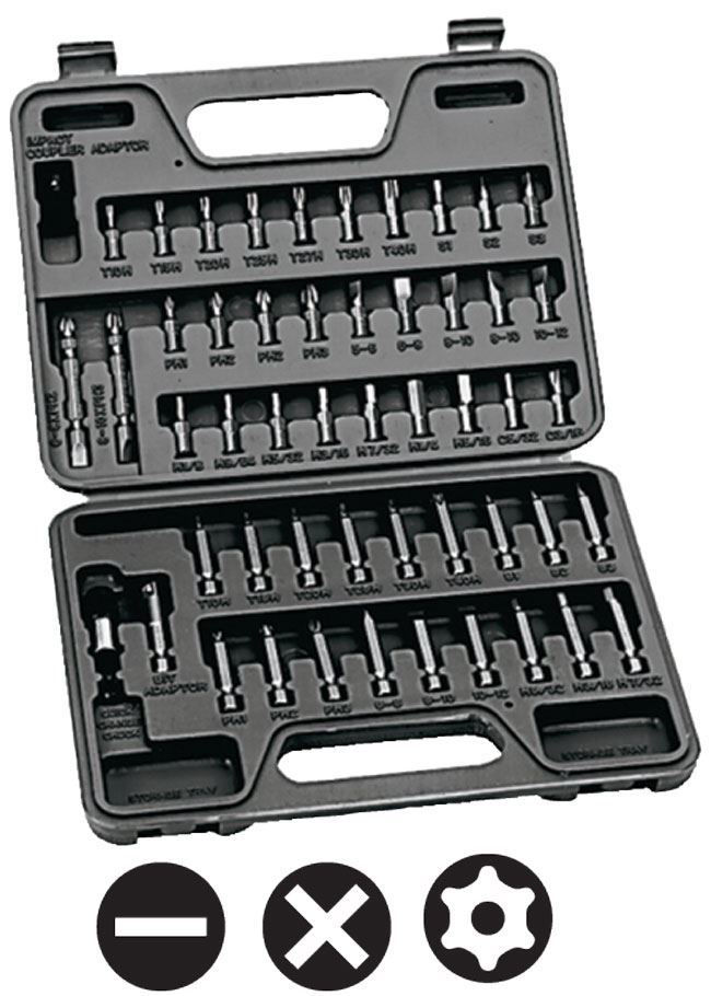 Includes 7 x six-lobe star (tamper-proof) insert bits, 3 x square insert bits, 4 x PHILLIPS® insert bits, 4 x slotted insert bits, 7 x hex insert bits, 2 x clutch insert bits, 6 x six-lobe star (tamper-proof) power bits, 3 x square power bits, 3 x PHILLIPS® power bits, 3 x slotted power bits, 3 x hex power bits, 3 x socket adaptors, 1 x quick-change chuck, 2 x PHILLIPS® double end bits and 1 x square bit holder in a storage case