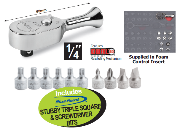 XXAPR230 1/4" Stubby Fixed Head Ratchet Includes Stubby Triple Square & Screwdriver Bits